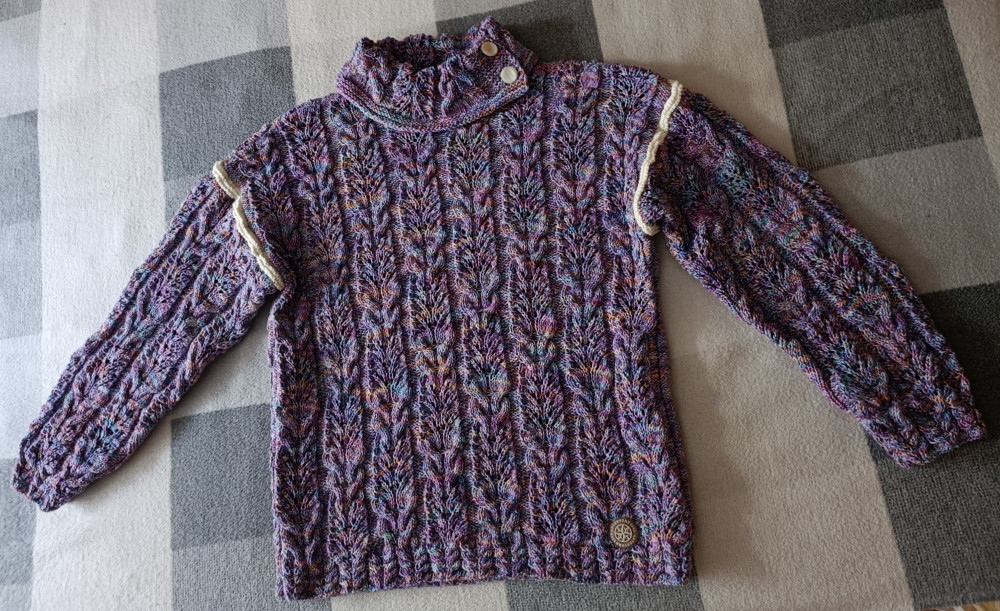 A fonal színe érdekes, mert szinte minden fényviszonynál kicsit más. Jó volt vele dolgozni, tökéletes a vastagsága, szépen kiadja a mintát. Kb. M-L nagyság között van. 46-47 dkg körül fogyott. Az ujjánál a fehér csíkot díszként tettem bele.